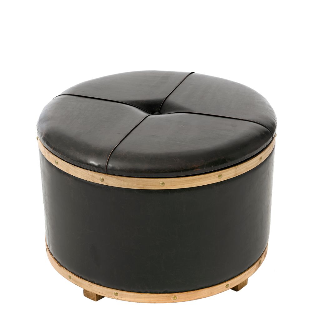 Wooden trunk stool with leatherette at the top. It has wooden legs and opens to be used as storage space.