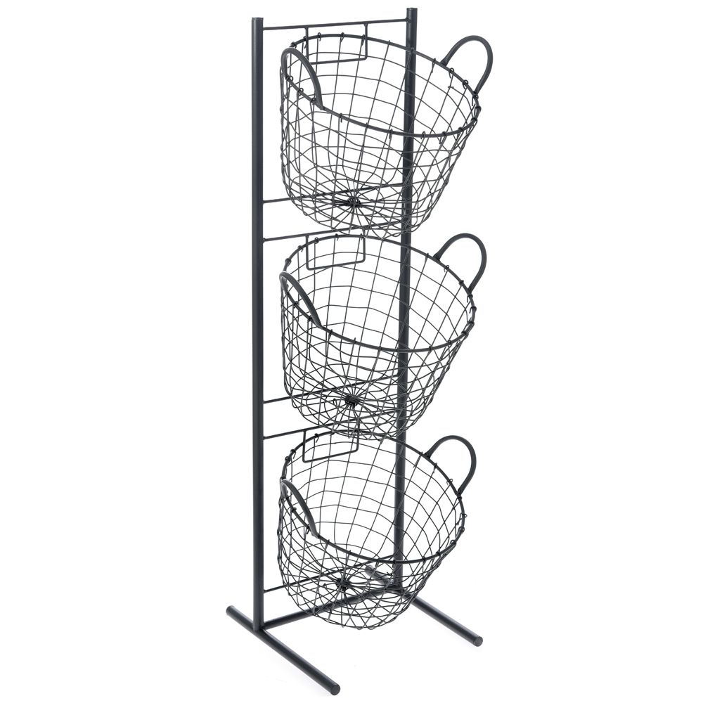 Metal base with 3 round conical baskets that are removable. Basket size diameter 24cm diameter up 33cm and basket height 24cm.